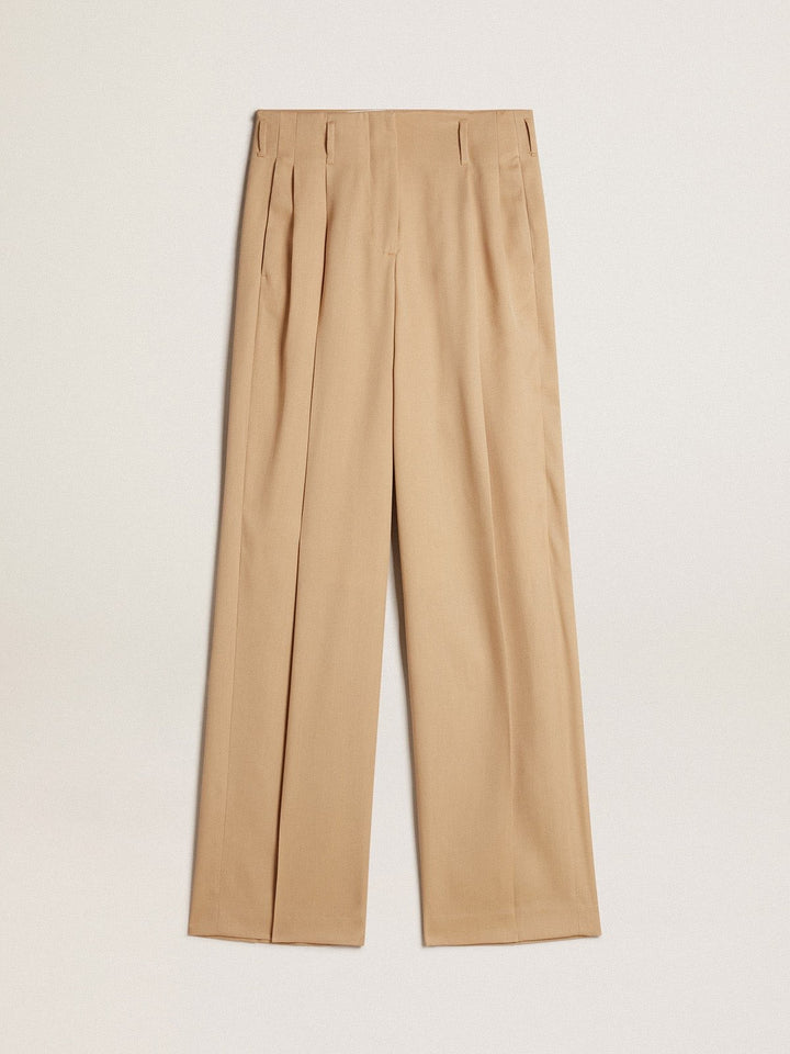 Di color sabbia, questo pantalone da donna in gabardine di lana si caratterizza per la vita alta, le righe frontali dall'anima sartoriale.