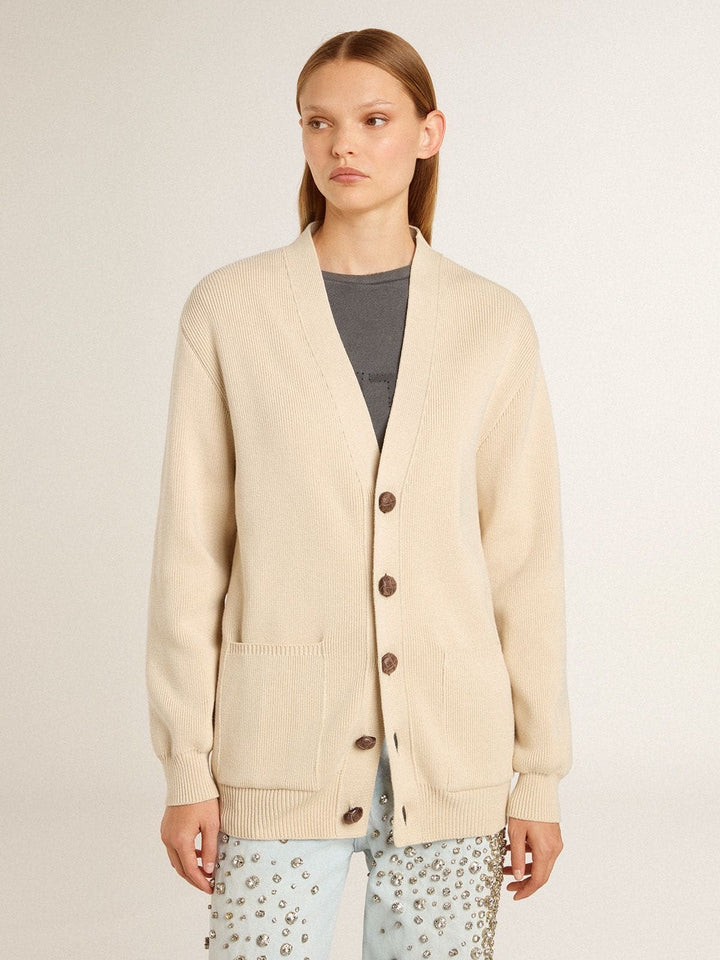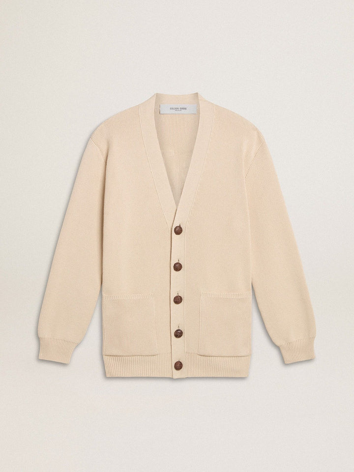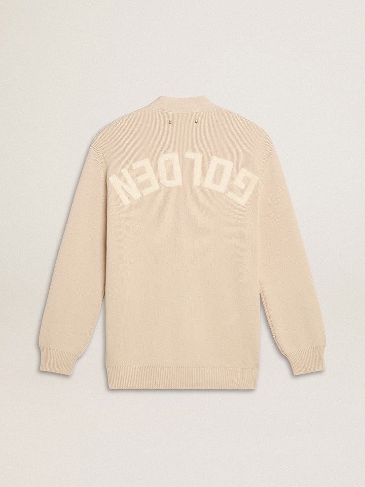 Cardigan in cotone caratterizzato dalla scritta a rovescio 'Golden' bianca sulla schiena e dalla chiusura con cinque bottoni marroni.